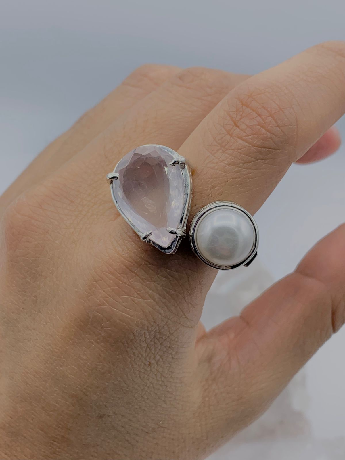 Anillo doble, Cuarzo Rosa gota de 17 mm alto * 12 mm ancho y  Perla de 9 mm alto * 9 mm ancho, piedras naturales en plata 925