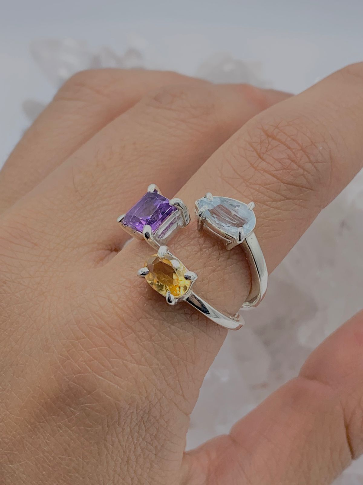 Anillo Multipiedras naturales Aguamarina gota de 8 mm alto * 4 mm ancho, Amatista cuadrada de 5 mm de alto * 5 mm ancho y Citrino ovalado de 6mm alto * 5 mm ancho en plata 925