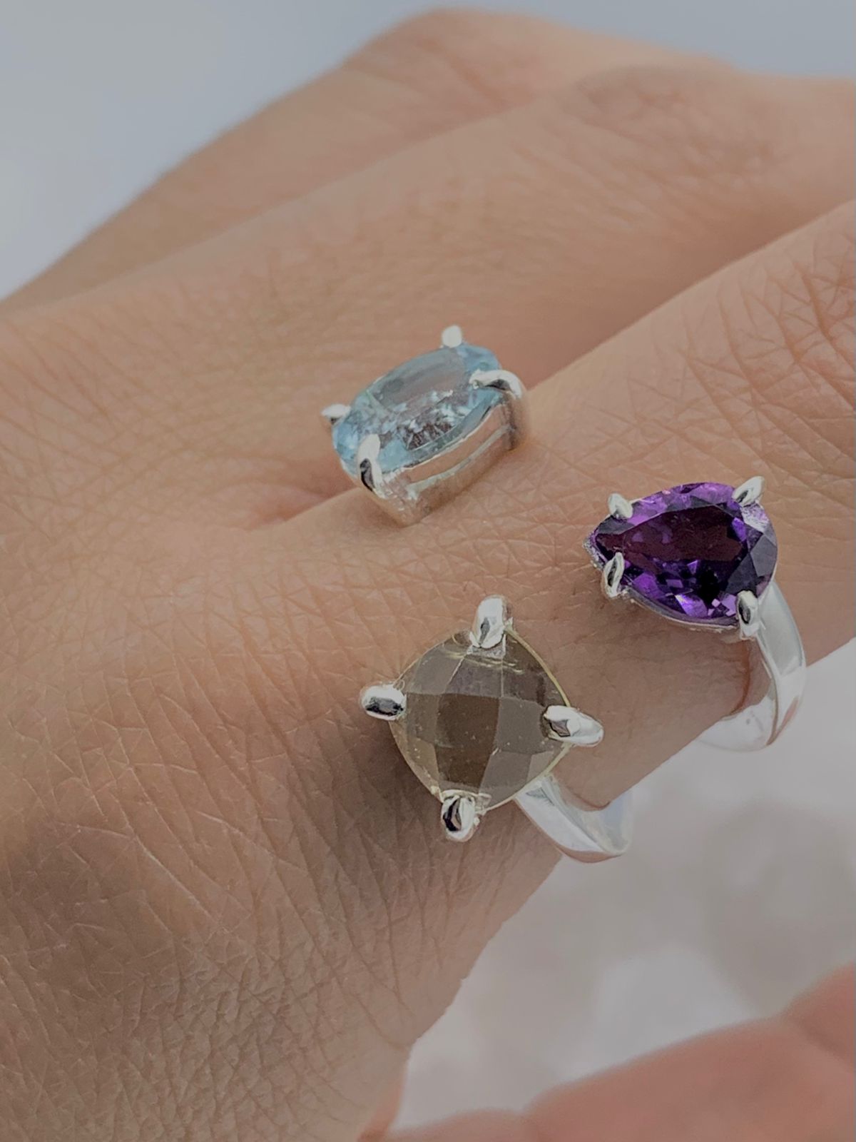Anillo Multipiedras naturales, Amatista gota de 7 mm alto * 5 mm ancho, Aguamarina ovalada de 8 mm alto * 6 mm ancho y Cuarzo Limón cuadrado de 7 mm alto * 7 mm ancho en plata 925