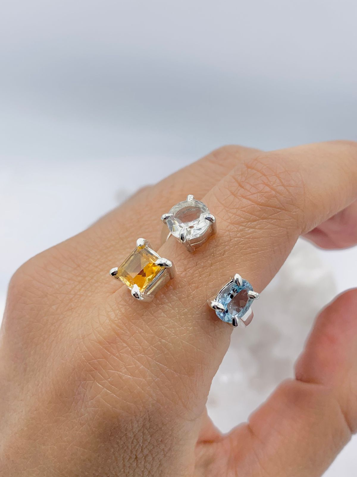 Anillo Multipiedras naturales Cuarzo Transparente redondo de 7 mm alto * 7 mm ancho, Citrino cuadrado de 6 mm de alto * 6 mm ancho y Aguamarina ovalada de 7 mm alto * 5 mm ancho en plata 925
