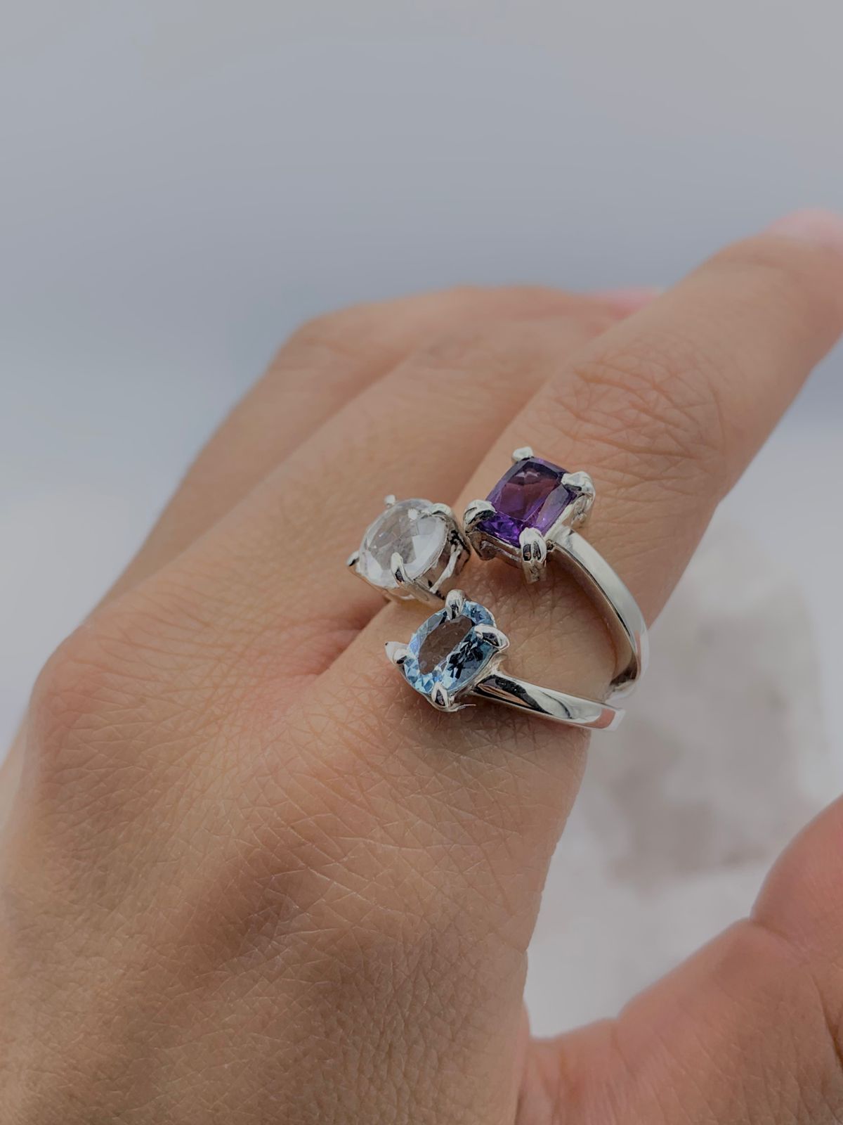 Anillo multipiedras Topacio Azul, Amatista y Cuarzo Transparente colección llénate de color